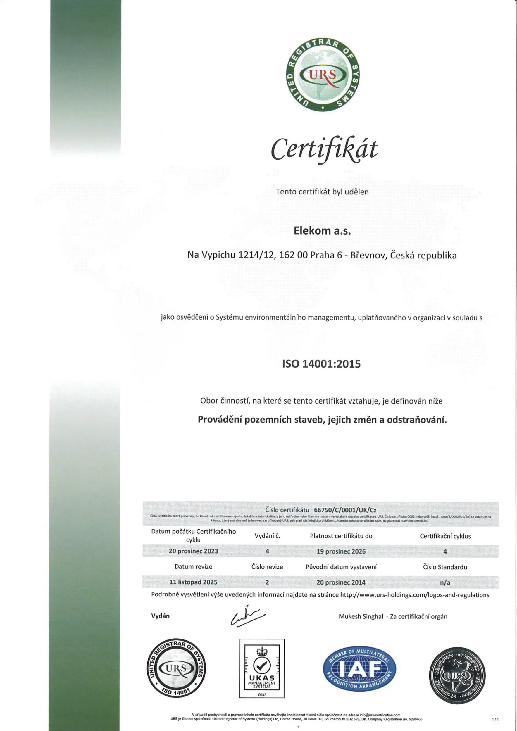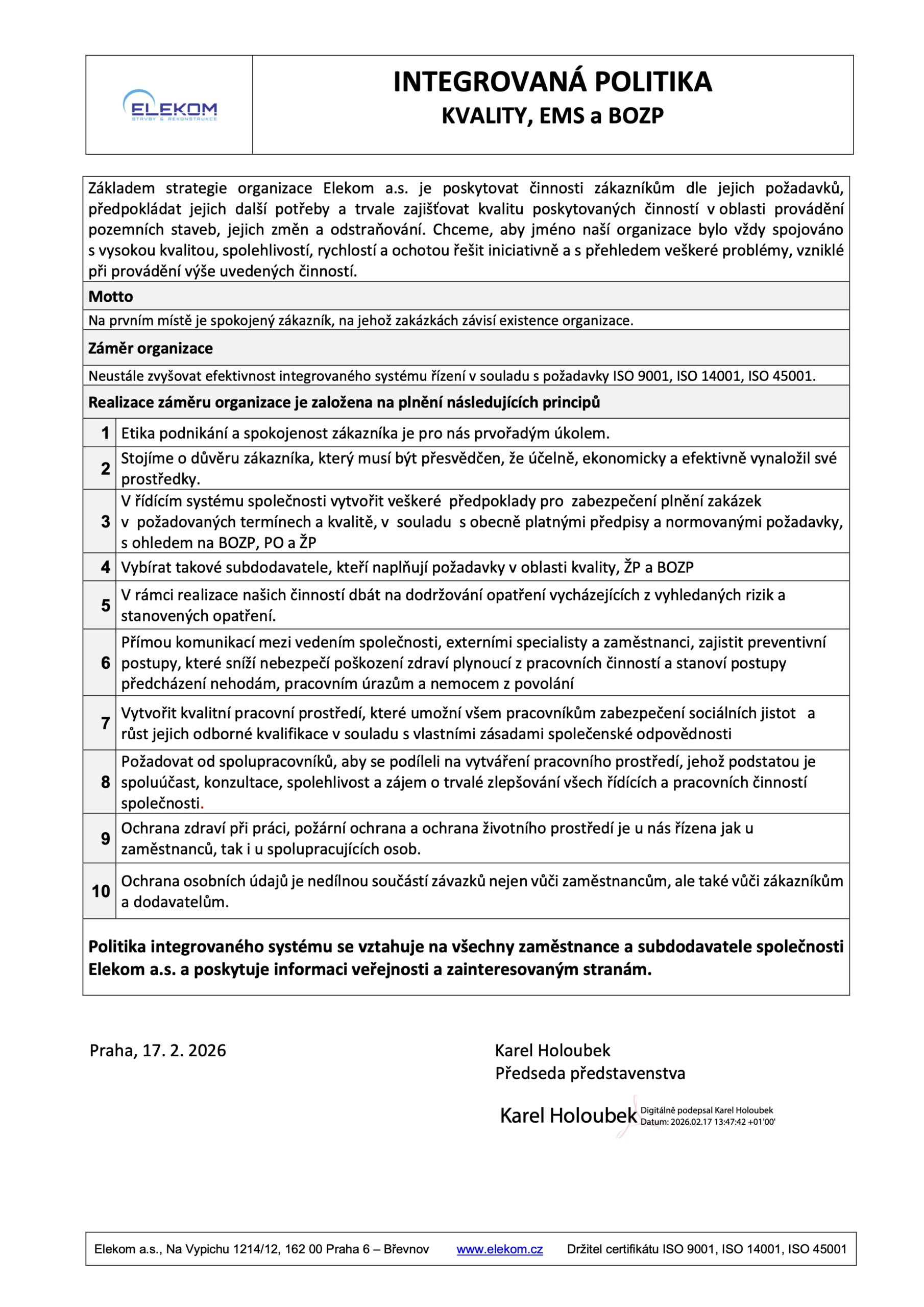 Společnost Elekom a.s. dlouhodobě staví na kvalitě, bezpečnosti a odpovědném přístupu ke svým zákazníkům, zaměstnancům i okolnímu prostředí. Tyto hodnoty jsou potvrzeny mezinárodně platnými certifikacemi integrovaného systému managementu:
